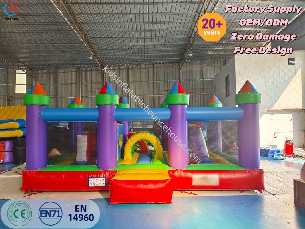 Questo vibrante castello a casa gonfiabile dai colori dell'arcobaleno presenta un design a più torri completo di percorso di ostacoli e scivolo per un gioco e un intrattenimento attivi continui.